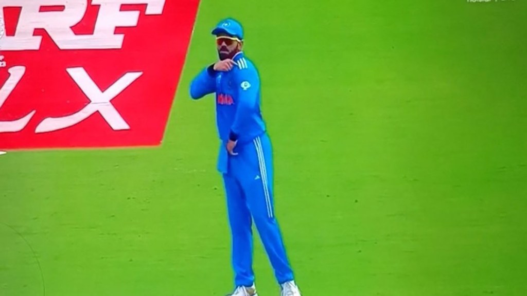 भारतीय क्रिकेट संघाने या सामन्यात प्रथम गोलंदाजी करण्याचा निर्णय घेतला. विराटने क्षेत्ररक्षण करताना पांढऱ्या रंगाच्या पट्ट्या असलेली जर्सी घातली होती, पण एका षटकानंतरच त्याच्या लक्षात आले. यादरम्यान तो पॅव्हेलियनकडे बोट दाखवतानाही दिसला. मात्र, पुढच्याच षटकात त्याने पुन्हा तिरंगा पट्टी असलेली नवी जर्सी घातली. काही सोशल मीडिया यूजर्सनी कोहलीचा जुनी जर्सी घातलेला फोटोही पोस्ट केला आहे. त्याचे हे फोटो सोशल मीडियावर सध्या खूप व्हायरल होत आहेत.