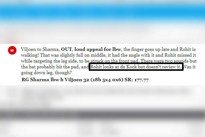५ व्या षटकाच्या दुसऱ्या चेंडूवर विल्जोएनने चेंडू फेकला. हा चेंडू रोहितच्या पॅडवर आदळला आणि पंचानी त्याला बाद ठरवले. याबाबत रोहितने नॉन स्ट्राईक असलेल्या डी कॉकला विचारणा केली. पण त्याने रिव्ह्यू घेऊ नये असे सुचवले आणि गोंधळामुळे मुंबईच्या संघाने रोहितची विकेट गमावली.