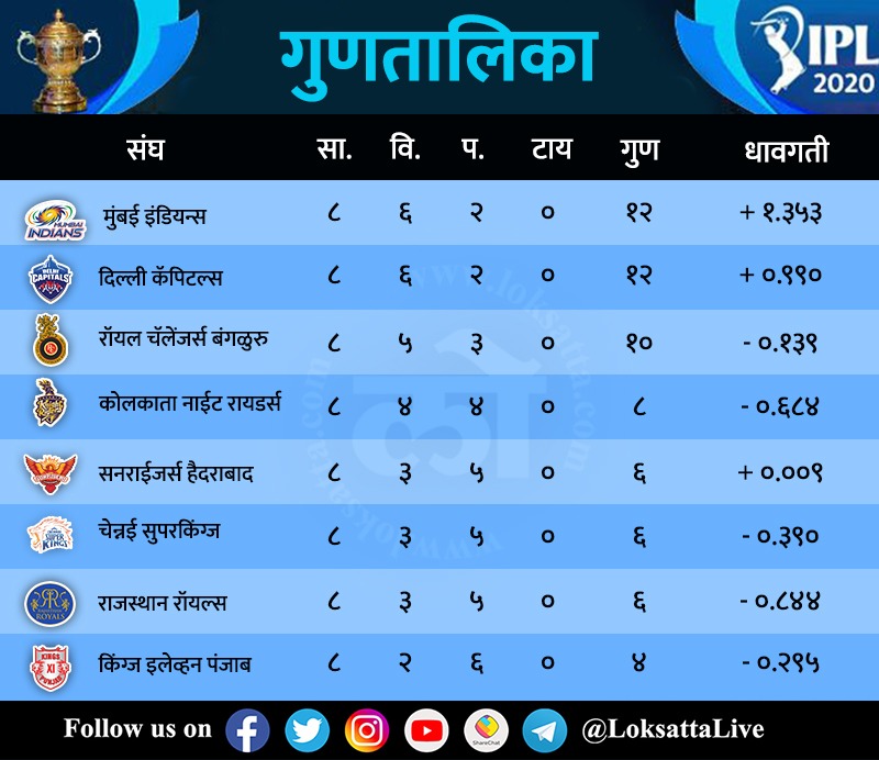 रोहित शर्माच्या मुंबई इंडियन्स संघानं कोलकाता संघाचा पराभव करत गुणतालिकेत अव्वल स्थानावर झेप घेतली आहे. याआधी दिल्लीचा संघ पहिल्या स्थानावर होता. मुंबईच्या संघानं आठ सामन्यात सहा विजय मिळवले आहेत. १२ गुणांसह मुंबईचा संघ अव्वल स्थानावर आहे तर चार गुणांसह पंजाबचा संघ आठव्या स्थानावर आहे. धमाकेदार सुरुवात करणारा पंजाबचा संघाला आपल्या कामगिरीत सातत्या राखता आलं नाही. पंजाबला आठ सामन्यात सहा पराभव स्वीकारवे लागले आहेत.