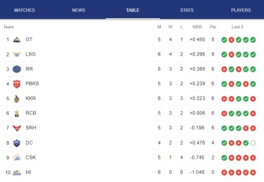 मुंबई इंडियन्स हा या पर्वामधील असा एकमेव संघ आहे ज्याला अद्याप एकही विजय मिळवता आलेले नाही. सहापैकी सहा सामन्यांमध्ये पराभव झाल्याने मुंबई पॉइण्ट्स टेबलमध्ये तळाशी आहे. ७० सामन्यांच्या साखळी फेरीमधील मुंबई विरुद्ध लखनऊ या २६ व्या सामन्यानंतर पॉइण्ट्स टेबल पाहिलं तर गुजरात आणि लखनऊ हे पहिल्यांदाच आयपीएल खेळणारे संघ अनुक्रमे पहिल्या व दुसऱ्या स्थानी आहेत. या दोन्ही संघांनी प्रत्येकी चार सामने जिंकले आहेत. गुजरातने पाच पैकी चार तर लखनऊने सहा पैकी चार सामने जिंकलेत.
