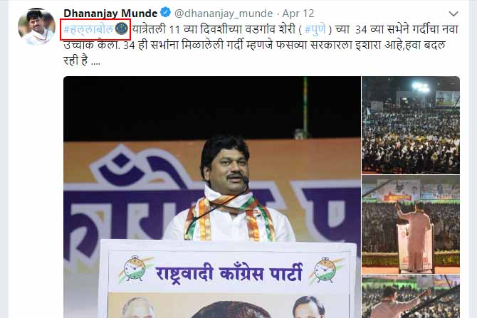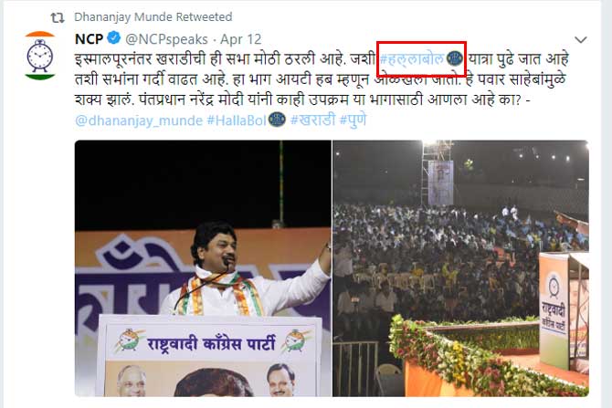 विशेष म्हणजे राष्ट्रवादी काँग्रेसचे नेतेही आपल्या ट्विटमध्ये #हल्लाबोल हॅशटॅग वापरताना राजस्थान रॉयल्सचे प्रमोशन होतानाचे चित्र दिसत आहेत. हॅशटॅगनंतर संघाचा लोगो इन्मोजी म्हणून दिसत असतानाही हे राष्ट्रवादी काँग्रेसच्या सोशल मीडिया टीमच्या लक्षात आलेलं दिसत नाही. मात्र यामुळे सोशल मीडियावर राष्ट्रवादी काँग्रेसची खिल्ली उडवली जात असून, हे आंदोलन जनतेसाठी आहे की राजस्थान रॉयल्स संघासाठी असं विचारलं जात आहे.