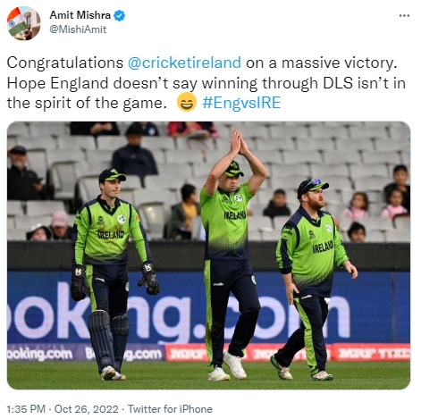 भारताचा माजी फिरकी गोलंदाज अमित मिश्राने आजच्या सामन्यानंतर आयर्लंडच्या संघाचं कौतुक केलं आहे. मात्र त्याचवेळी त्याने इंग्लंडच्या संघाला खोचक शब्दांमध्ये टोला लगावला आहे. इंग्लंड आता या सामन्याच्या निकालानंतर पुन्हा रडगाणं करत हा निकाल खेळभावनेला धरुन नाही अशी आरडाओरड करणार नाही अशा आशयाची पोस्ट अमित मिश्राने केली आहे. त्याने या पोस्टमध्ये आयर्लंडच्या संघाचा फोटोही पोस्ट केला आहे. तसेच क्रिकेट आयर्लंडच्या ट्वीटर हॅण्डललाही टॅग केलं आहे.