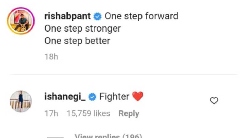 ऋषभच्या फोटोवर अनेक चाहत्यांनी कमेंट केल्या आहेत. ऋषभची गर्लफ्रेंड ईशा नेगीनेही त्यावर कमेंट केली आहे. ईशा नेगीने ऋषभला “लढाऊ” म्हटलं आहे. तसेच, हार्टची इमोजीही टाकली आहे. ३० डिसेंबरला ऋषभचा अपघात झाल्यानंतर एक महिना ईशा नेगी समाज माध्यमांवर सक्रिय नव्हती.