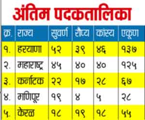या स्पर्धेतील अग्रस्थानासाठी महाराष्ट्र आणि हरयाणा यांच्यात अखेरच्या दिवसापर्यंत चढाओढ सुरू होती. मात्र यजमान हरयाणाला अखेरीस वरचढ ठरण्यात यश आले. अंतिम पदकतालिकेत अग्रस्थान पटकावणाऱ्या हरयाणाच्या खात्यावर ५२ सुवर्ण, ३९ रौप्य आणि ४६ कांस्य अशी एकूण १३७ पदके होती. तर दुसऱ्या स्थानावरील महाराष्ट्राने ४५ सुवर्ण, ४० रौप्य आणि ४० कांस्यपदकांसह एकूण १२५ पदके पटकावली.