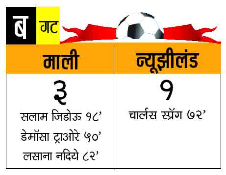 गतउपविजेत्या मालीने नवी दिल्ली येथील जवाहरलाल नेहरू स्टेडियमवर झालेल्या लढतीत न्यूझीलंडविरुद्ध निर्विवाद वर्चस्व गाजवले. किवींकडून एक गोल झाला, परंतु त्यांच्या खेळात ढिसाळपणा होता. शारीरिक तंदुरुस्तीत न्यूझीलंडचे खेळाडू मालीवर भारी होते. तरीही मालीच्या खेळाडूंची चतुर खेळाची रणनीती वापरताना चेंडूवर सर्वाधिक काळ ताबा राखला. सोबतच त्यांनी न्यूझीलंडच्या पेनल्टी क्षेत्रावर सातत्याने आक्रमण करत गोल करण्याच्या संधी निर्माण केल्या. त्यांना लवकर यश मिळाले. सलाम जिडोऊने ३० यार्डावरून चेंडू गोलजाळीच्या दिशेने अचूक टोलवत मालीला १८व्या मिनिटाला १-० अशी आघाडी मिळवून दिली. ४३व्या मिनिटाला डेमॉसा ट्राओरे गोल करण्याच्या अगदी समीप पोहोचला होता, परंतु त्याने टोलावलेला चेंडू गोलखांब्यावर आदळला.