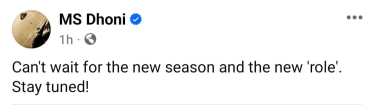 महेंद्रसिंह धोनी समाजमाध्यमांवर सक्रीय नसतो. सध्या सगळीकडे आयपीएलची चर्चा आहे. महेंद्रसिंह धोनी आयपीएलमध्ये चेन्नई सुपर किंग्ज या संघाकडून खेळतो. विशेष म्हणजे त्याच्यावर या संघाच्या कर्णधारपदाची जबाबदारी असते. आयपीएलच्या या हंगामाला अवघे काही दिवस शिल्लक आहेत. असे असतानाच त्याने फेसबूकवर अवघ्या एका ओळीची पोस्ट टाकली आहे. ‘आयपीएलच्या नव्या हंगामाची मी आतुरतेने वाट पाहतोय. सोबतच मी या हंगामात नव्या भूमिकेत दिसणार असून त्याचीही मला उत्सुकता लागली आहे,’ अशा आशायची पोस्ट धोनीने केली आहे.