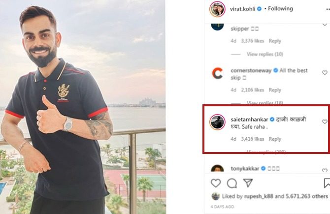 साहजिकचं विराटच्या या फोटोवर त्याच्या चाहत्यांनी त्याला यंदा ट्रॉफी जिंकूनच ये…आणि शुभेच्छांचे संदेश दिले. परंतू विराटच्या या पोस्टवर मराठी सिने-सृष्टीतली आघाडीची अभिनेत्री सई ताम्हणकरने, दाजी काळजी घ्या, सेफ रहा ! अशी कमेंट केली आहे. सईच्या या अतरंगी कमेंटला नेटकऱ्यांनीही पसंती दर्शवली आहे.