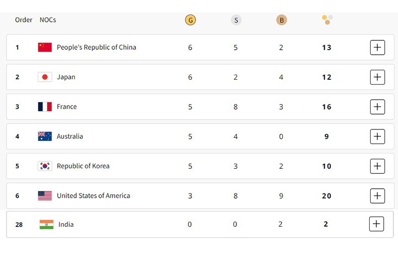 पदकतालिकेत चीन आणि जपान हे देश अव्वल स्थानी आहेत. ऑलिम्पिकचे तीन दिवस पूर्ण झाल्यानंतर पदकतालिकेत जपान पहिल्या क्रमांकावर आहे. जपानने आतापर्यंत एकूण १२ पदके जिंकली असून त्यात ६ सुवर्ण, ३ रौप्य आणि ४ कांस्य पदकांचा समावेश आहे. तर यजमान देश फ्रान्स दुसऱ्या स्थानावर आहे. फ्रान्सने आतापर्यंत ५ सुवर्ण, ८ रौप्य आणि ३ कांस्यपदके जिंकली आहेत. म्हणजेच त्याच्या नावे एकूण १६ पदके आहेत. जपानकडे ६ सुवर्ण असल्याने ते पदकतालिकेत पहिल्या क्रमांकावर आहे. चीनबद्दल बोलायचे तर चीनने आतापर्यंत ५ सुवर्ण, ५ रौप्य आणि २ कांस्य पदके जिंकली आहेत. त्यांच्या एकूण पदकांची संख्या १२ पर्यंत आहे.