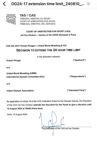 भारतीय ऑलिम्पिक संघटनेने आपल्या निवेदनात म्हटले होते की एकमेव पंच डॉ. ॲनाबेल बेनेट एसी (ऑस्ट्रेलिया) यांनी विनेश फोगट, युनायटेड वर्ल्ड रेसलिंग, आंतरराष्ट्रीय ऑलिम्पिक समिती आणि आयओए या सर्व पक्षांचे सुमारे तीन तास ऐकले.