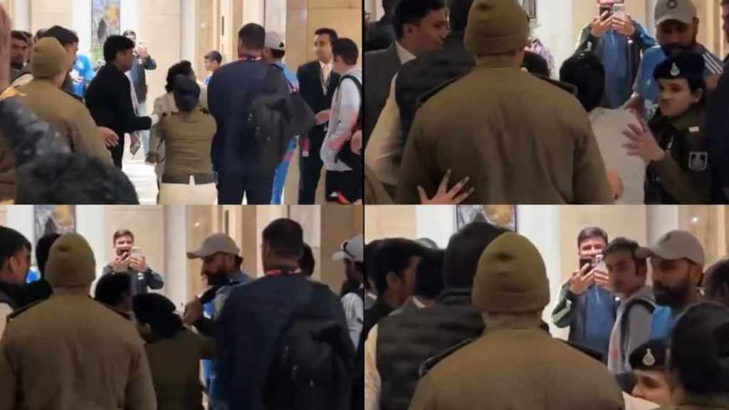 रोहित शर्मा सामन्यानंतर टीम हॉटेलमध्ये पोहोचला होता. त्याच्याबरोबर संपूर्ण सिक्युरिटी होती. यादरम्यान अचानक, एक महिला आली, सुरक्षारक्षकांच्या मधूनच ती रोहित शर्माजवळ पोहोचली आणि तिने त्याचा हातही धरला. अचानक त्या महिलेला पाहून हिटमॅनलाही धक्का बसला, त्यानंतर सुरक्षा कर्मचाऱ्यांनी त्या महिलेला रोहितपासून दूर नेलं.