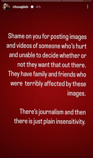 रितिका सजदेवने इन्स्टाग्राम स्टोरीवर एक फोटो शेअर केला आहे. “एखाद्या जखमी असलेल्या किंवा इजा झालेल्या व्यक्तीचे फोटो आणि व्हिडीओ पोस्ट करताना तुम्हाला लाज वाटली पाहिजे. असे फोटो किंवा व्हिडीओ शेअर करायचे की नाही याबद्दलही तुम्ही विचार करायला हवा. यामुळे त्याचे कुटुंबीय आणि मित्र यांच्यावर मोठा परिणाम झाला आहे. एकीकडे पत्रकारिता आहे आणि दुसरीकडे फक्त असंवेदनशीलता”, असे रितिकाने म्हटले आहे.