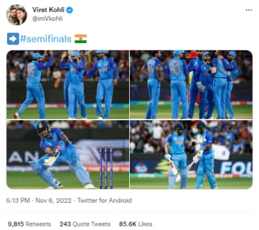 भारताने झिम्बाब्वेविरुद्धच्या विजयासहीत उपांत्य फेरीमध्ये प्रवेश केल्यानंतर विराटने या सामन्यातील चार फोटो पोस्ट केले आहे. यापैकी एका फोटोत तो विराटबरोबर विकेटचं सेलिब्रेशन करताना दिसत आहे. दुसऱ्या फोटोत हार्दीक पंड्याच्या खांद्यावर हात ठेऊन हसताना दिसत आहे. तिसऱ्या फोटोत सूर्यकुमार यादव फटकेबाजी करताना दिसतोय तर चौथ्या फोटोत विराट आणि राहुल एकत्र फलंदाजी करतानाचा एक क्षण कॅमेरात कैद झाल्याचं दिसत आहे. हे फोटो शेअर करताना विराटने एका शब्दाची कॅप्शन दिली आहे. उजवीकडे जाणारा बाण आणि भारतीय तिरंग्याच्या इमोजीमध्ये हॅशटॅग वापरुन सेमीफायनल्स शब्द लिहिला आहे. #semifinals अशी कॅप्शन विराटने दिली आहे.
