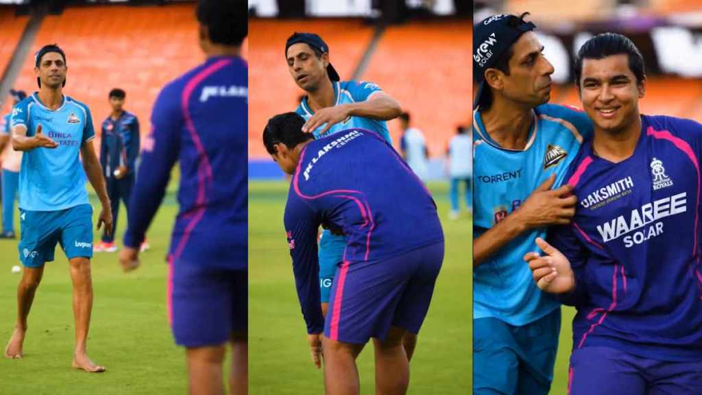 गुजरात-राजस्थान सामन्याच्या एक दिवस आधी दोन्ही संघ सरावाला उतरले असतानाचा व्हीडिओ समोर आला आहे. अहमदाबादमधील नरेंद्र मोदी स्टेडियमवर दोन्ही संघ एकत्र सराव करत होते. सामन्यादरम्यान वैभव सूर्यवंशीदेखील मैदानावर होता. गुजरात टायटन्सचे प्रशिक्षक आशिष नेहरा यांच्या नजरेस हा तरुण फलंदाज पडताच वैभव त्याची भेट घेण्यासाठी पुढे गेला. नेहराला जवळ येताना पाहून वैभव थेट त्याच्याजवळ गेला आणि त्याने त्याच्या पायांना स्पर्श कjत आशीर्वाद घेतला. यानंतर आशिष नेहराने देखील थांबवलं आणि त्याचं कौतुक करत त्याला स्पर्धेसाठी शुभेच्छा देत असल्याच्या त्याच्या हावभावावरून दिसून आलं.