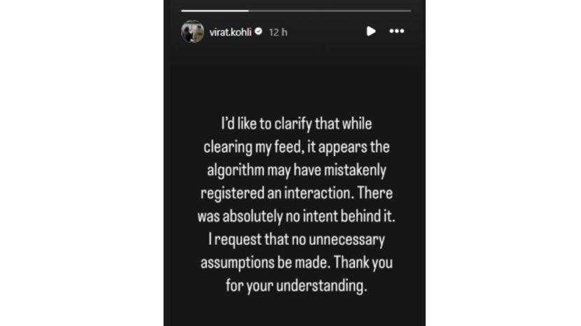 विराटने पोस्ट केलेल्या स्टोरीमध्ये त्याने लिहीले की, “मी हे स्पष्ट करू इच्छितो की माझे फीड क्लिअर करताना, असे दिसते की अल्गोरिदमने चुकून इंटरॅक्शन नोंदवले असावे. त्यामागे कोणताही हेतू नव्हता. मी विनंती करतो की कोणतेही अनावश्यक अंदाज बांधू नका. तुम्ही समजून घेतल्याबद्दल धन्यवाद.” दरम्यान अवनीत कौरने मात्र या सर्व प्रकाराबद्दल अद्याप कोणतीही प्रतिक्रिया दिलेली नाही.