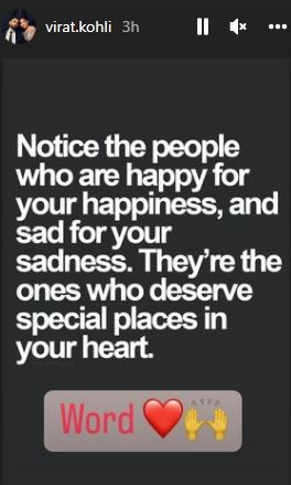 विराट कोहलीने इन्स्टाग्रामवर एक स्टोरी शेअर केली आहे. या स्टोरीमध्ये त्याने कोणत्या लोकांना हृदयात स्थान दिले जावे, याबाबत मत व्यक्त केलेआहे. “जे लोक तुमच्या आनंदात आनंदी आणि तुमच्या दु:खात दु:खी असतात त्यांना ओळखा. हे लोक तुमच्या हृदयात विशेष स्थान मिळण्याच्या लीयकीचे असतात, ” असे विराट कोहली आपल्या इन्स्टाग्राम स्टोरीमध्ये म्हणाला आहे.