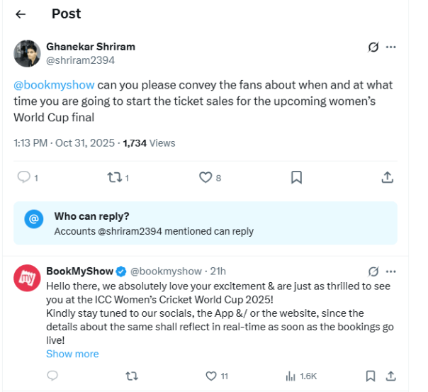 तिकीट विक्रीला सुरुवात केव्हा होणार? हे जाणून घेण्यासाठी एका युजरने बुक माय शो ॲपच्या सोशल मीडिया अकाउंटला टॅग करून विचारलं की, तिकीट विक्रीला सुरुवात केव्हा होणार? या पोस्टवर बुक माय शोने आपली प्रतिक्रिया दिली आहे. ते म्हणाले, “नमस्कार, आम्हाला तुमचा आनंद आवडला. आयसीसी महिला वर्ल्डकप २०२५ स्पर्धेत तुम्हाला पाहून तितकाच आनंद झाला आहे. कृपया आमच्या सोशल मीडिया, अॅप आणि/किंवा वेबसाइटशी संपर्कात रहा, कारण बुकिंग लाईव्ह होताच त्याबद्दलची माहिती रिअल-टाइममध्ये दिसून येईल.”