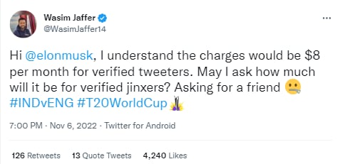 “हाय एलॉन मस्क, मला कल्पना आहे की व्हेरिफाइड ट्वीटर अकाऊंटसाठी महिन्याला आठ डॉलर्स आकारले जाणार आहेत. मात्र कायम अपयशी ठरणारे किंवा अपयशाला घाबरणारे अशी ओळख निर्माण झालेल्यांकडून किती पैसे आकारले जाणार आहेत. मी एका मित्रासाठी ही विचारपूस करत आहे,” असं जाफरने म्हटलं आहे. या ट्वीटमध्ये त्याने तोंडाला चैन लावलेला इमोजीही वापरला असून भारत विरुद्ध इंग्लंड आणि टी-२० विश्वषचक असे हॅशटॅगही वापरले आहेत.