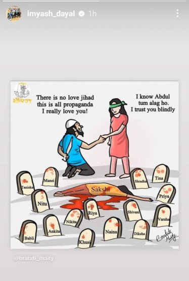 यश दयालने सोमवारी सकाळी आपल्या इन्स्टाग्राम अकाउंटवर एक स्टोरी शेअर केली होती. या स्टोरीमध्ये एक मुलगा डोक्यावर पांढरी गोल टोपी घातलेला आहे आणि हातात चाकू घेऊन गुडघ्यावर बसलेला आहे. त्याने डोळ्यावर पट्टी बांधलेल्या मुलीचा हात धरला आहे. जवळच एका मुलीचा मृतदेह आहे ज्यावर साक्षी असे लिहिले आहे. आजूबाजूला आणखी अनेक कबरी आहेत ज्यावर हिंदू मुलींची नावे लिहिली आहेत.