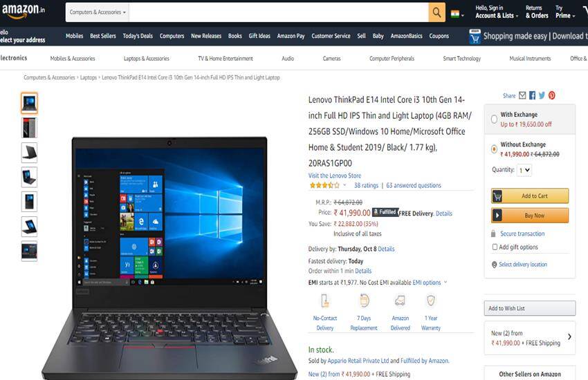Lenovo ThinkPad E14 लॅपटॉपवर 35 टक्केंची सूट देण्यात आली आहे. डिस्टाउंटनंतर ThinkPad E14 या लॅपटॉपची किंमत ४१ हजार ९९० रुपये आहे. डिस्काउंटपूर्वी या लॅपटॉपची किंमत ६४ हजार ८७२ इतकी होती. म्हणजेच ThinkPad E14 या लॅपटॉपवर २२ हजार ८८२ रुपयांची सूट देण्यात आली आहे.