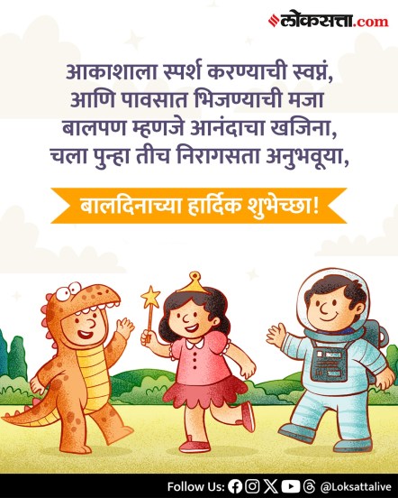 बालदिनाचं खरं वैशिष्ट्य म्हणजे त्या छोट्या मनांतील मोठ्या स्वप्नांचा सन्मान! ही ती पिढी आहे, जी उद्याचा भारत घडवणार आहे आणि म्हणूनच आजचा दिवस आपल्याला आठवण करून देतो की प्रत्येक मुलाला प्रेम, शिक्षण आणि बालपणाचं स्वातंत्र्य मिळायला हवं. या विशेष दिवशी तुम्हीही तुमच्या स्टेटसमध्ये सुंदर बालदिनाच्या शुभेच्छा संदेश ठेवा, त्या निष्पाप हास्याला अभिवादन करा आणि आनंद वाटा; कारण प्रत्येक मोठ्या माणसाच्या मनात आजही एक लहानसं मूल जिवंत आहे, जे हसण्याची, खेळण्याची आणि स्वप्नं पाहण्याची वाट बघतंय. चला, त्या बालपणाला पुन्हा जगू या… आणि सर्वांना देऊ या मनापासून बालदिनाच्या हार्दिक शुभेच्छा! या निमित्ताने तुम्ही तुमच्या प्रियजनांसोबत हे शुभेच्छा संदेश शेअर करू शकता.