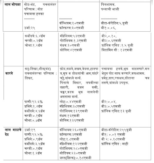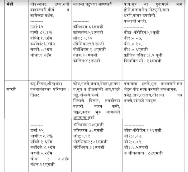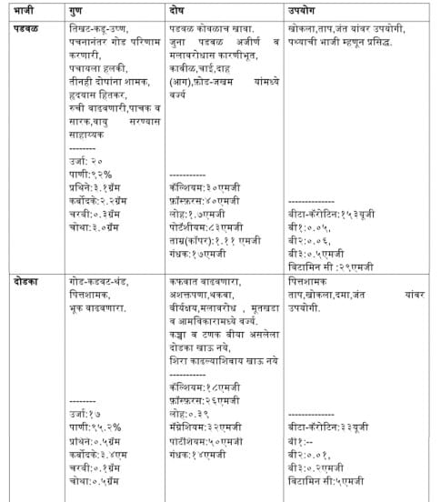 त्या भाज्यांचे विशेष महत्त्व लक्षात यावे म्हणून या लेखात सोबत एक मोठा तक्ता दिलेला आहे. या दिवशी वापरल्या जाणाऱ्या पडवळ, दोडका, भेंडी, कारलं, लाल भोपळा, लाल माठाचे देठ या भाज्यांतून कोणती पोषक तत्त्वे मिळतात आणि त्यांचे प्रमाण काय याची सविस्तर माहिती दिलेली आहे. त्या भाज्यांचे गुणधर्म आणि त्या भाज्यांमधून मिळणारे पोषण जाणून घेऊ.