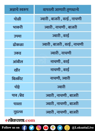अनेकदा उष्ण म्हणून तृणधान्यांचा अत्यल्प समावेश आपल्या आहारात केला जातो. परंतु योग्य प्रमाणात आणि योग्य प्रकारे आपण ही भारतीय तृणधान्ये आहारात जरूर सामावून घेऊ शकतो. सामान्यपणे खालील स्वरूपात तृणधान्ये खाल्ली जातात.
