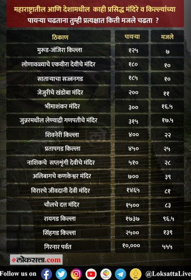 एक मजला चढण्यासाठी सरासरी १८ पायर्या चढाव्या लागतात. याचा अर्थ दोन मजले म्हणजे ३६ पायर्या आणि चार मजले म्हणजे ७२ पायर्या. सर्वसामान्य माणसाला सराव नसेल, तर चार मजले सहजगत्या चढणे शक्य नाही. आता महाराष्ट्रातील आणि देशामधील काही प्रसिद्ध मंदिरे व किल्ल्यांच्या पायर्या किती आणि त्या तेवढ्या पायर्या चढताना तुम्ही प्रत्यक्षात किती मजले चढणार याचा विचार करू. त्याशिवाय तुम्हाला तुमच्या शरीराला होणारा त्रास समजणार नाही.
