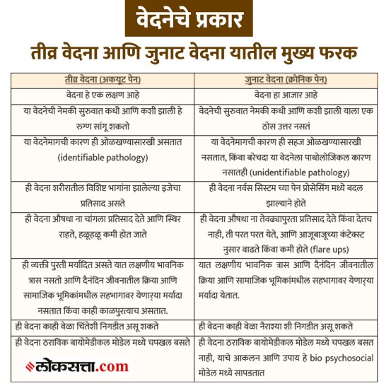 २. क्रॉनिक पेन (जुनाट वेदना): शरीराच्या एका किंवा अनेक भागात एकाचवेळी होणारी वेदना जी तीन महिन्यांपेक्षा जास्त काळ टिकून राहते किंवा जिची पुनरावृत्ती होते. यासोबत लक्षणीय भावनिक त्रास आणि दैनंदिन जीवनातील क्रिया आणि सामाजिक भूमिकांमधील सहभागावर येणार्या मर्यादा हे या वेदनेचं वैशिष्ट्य आहे. उदाहरणार्थ: जुनाट कंबरदुखी, संधिवात, न्युरोपथिक पेन, फाईब्रोमाएलजिया