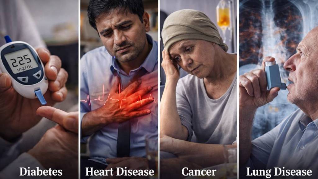 भारतीय वैद्यकीय संशोधन परिषद (आयसीएमआर) च्या अलीकडील अभ्यासानुसार, देशात सुमारे १० कोटींहून अधिक नागरिक मधुमेहाने ग्रस्त असून जवळपास १३ कोटी लोक प्री-डायबेटिक अवस्थेत आहेत. चिंताजनक बाब म्हणजे तरुणांमध्येही मधुमेह आणि उच्च रक्तदाबाचे प्रमाण झपाट्याने वाढत आहे. तज्ज्ञांच्या मते ४० वर्षांखालील लोकांमध्ये जीवनशैलीजन्य आजारांचे प्रमाण पूर्वीपेक्षा दुपटीने वाढले आहे.कर्करोगाच्या रुग्णसंख्येतही सातत्याने वाढ होत आहे. प्रदूषण, तंबाखू सेवन, अयोग्य आहार आणि मानसिक ताण ही प्रमुख कारणे असल्याचे डॉक्टरांचे मत आहे. शहरी भागातील बैठी जीवनशैली, दीर्घ कामाचे तास आणि शारीरिक हालचालींचा अभाव यामुळे लठ्ठपणा वाढत असून तो अनेक गंभीर आजारांना आमंत्रण देत आहे.