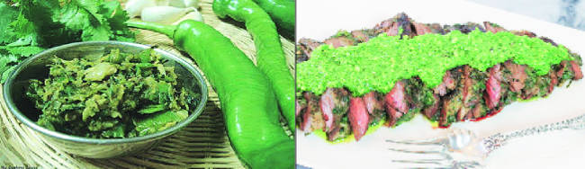 या चिमिचुरीचे वर्णन वाचून, चव चाखून, मला आपल्या ठेच्याची आठवण येत राहिली! अगदी गावरान दिसणारा ठेचा आता आकर्षक बंद पाकिटातूनदेखील विक्रीस येतो. तरी ताज्या ठेच्याची चव निराळीच! लाल मिरच्यांचा ठेचा आणि हिरव्या मिरच्यांचा ठेचा ही दोन्ही अगदी रांगडी प्रकरणे! ताज्या भाकरीसोबत किंवा शिळ्या पोळीसोबत, कधी तर चक्क ब्रेडला सॉससारखे फासून, कसेही खाल्ले तरी अशा फक्कड जमलेल्या ठेच्याची लज्जत काय वर्णावी! वऱ्हाडी ठेच्याची एक अदा तर कोल्हापुरी ठेच्याची दुसरीच तऱ्हा! चुलीवर खोलगट कढईत किंचित भाजून घेतलेल्या हिरव्या मिरच्यांचा सर्वदूर पसरलेला खाट, त्यावर मोगरीच्या कळ्या भासाव्या अशा लसणीच्या पाकळ्या आणि किंचित भरडसर मीठ! कोमट झाल्यावर बत्त्याने ठेचून घेतले, पुन्हा कढत तेलात किंचित परतून घेतले की झाला चमचमीत ठेचा तयार! लाल सुक्या मिरच्यांचा वऱ्हाडी ठेचा तसाच. रंगच इतका आकर्षक की नजर खिळून राहील! प्रत्येक घासाला जिभेवर झोंबणारा, मनात आणि पोटात तेवढीच आग लावणारा हा अगदी आवडता पदार्थ! भारतात राजस्थान, मध्यप्रदेश, महाराष्ट्र, कर्नाटक, तेलंगणा आणि आंध्रप्रदेश अशा अनेक राज्यात खास मान्यता मिळवलेला हा पदार्थ अगदी अवचित दूरच्या देशी भेटला, निराळ्या रूपात! तरी त्यातील नखरेल हिरवेपण, फटकळ जहालपण आणि खुमासदार अदा काही लपत नव्हती!