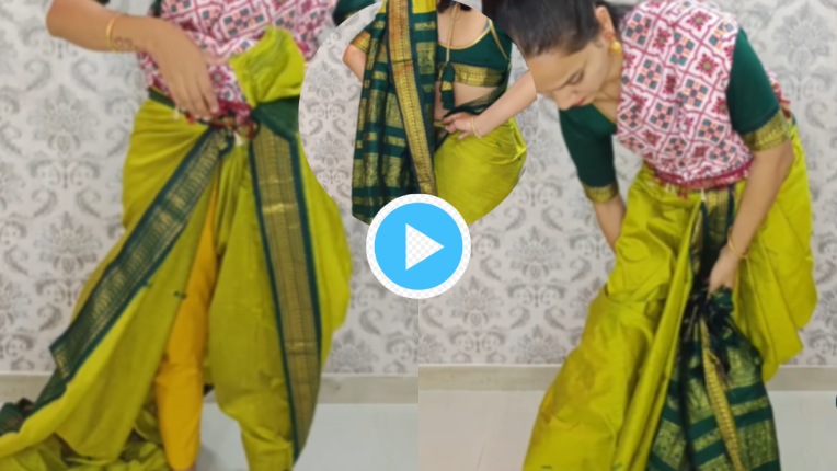 How To Wear Nauvari Saree Marathi Video: गणपती बाप्पाचं आगमन आता काहीच दिवसांवर येऊन ठेपलं आहे. बाप्पांच्या पाठोपाठ २२ सप्टेंबरला गौराई सुद्धा माहेरपणाला येतील. आपल्यापैकी अनेकांची गणपतीसाठीची व स्वतःसाठीची खरेदी आतापर्यंत झालीच असेल, हो ना? साड्या, मॅचिंग ब्लाउज, छान- छान दाग- दागिने घालून नटण्यासाठी हा हक्काचाच सण आहे. यंदाच्या गणपतीत जर तुम्ही सगळ्या बहिणी किंवा नणंद- भावजया, सासू-सुना नऊवारी नेसण्याच्या विचारात असाल तर आजचा व्हिडीओ तुमच्यासाठी खास आहे. तसंतर अलीकडे सगळ्या मैत्रिणी रेडी टू वेअर नऊवारी शिवून घेतात, पण गणपतीच्या घाईत वेळेत साडी शिवून मिळेलच असा काही भरवसा देता येत नाही. शिवाय अगोदरच महागडी साडी घ्या आणि मग परत शिवायला हजार रुपये टाका, इतका खर्च करण्यापेक्षा ही झटपट २ मिनिटात नेसून होणारी नऊवारी काय वाईट आहे? चला बघूया..