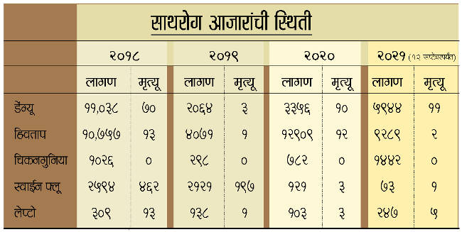 गेल्या वर्षी अन्य पावसाळी आजारांच्या चाचण्या, सर्वेक्षण कमी प्रमाणात झाल्यामुळे डेंग्यूचा प्रादुर्भाव तुलनेने फार कमी होता. परंतु यंदा जुलैपासूनच डेंग्यूने डोके वर काढायला सुरूवात केली. गेल्यावर्षी डेंग्यूचे ३३५६ रुग्ण तर १० मृत्यू होते. परंतु यावर्षी रुग्णसंख्येत जवळपास ७७ टक्कय़ांनी वाढ होऊन ती रुग्णसंख्या ५९४४ झाली आहे, तर ११ मृत्यू झाले आहेत.