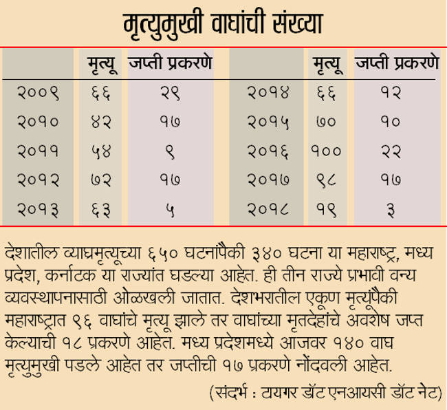 देशातील व्याघ्रमृत्यूच्या ६५० घटनांपकी ३४० घटना या महाराष्ट्र, मध्य प्रदेश, कर्नाटक या राज्यांत घडल्या आहेत. ही तीन राज्ये प्रभावी वन्य व्यवस्थापनासाठी ओळखली जातात. देशभरातील एकूण मृत्यूंपकी महाराष्ट्रात ९६ वाघांचे मृत्यू झाले तर वाघांच्या मृतदेहांचे अवशेष जप्त केल्याची १८ प्रकरणे आहेत. मध्य प्रदेशमध्ये आजवर १४० वाघ मृत्युमुखी पडले आहेत तर जप्तीची १७ प्रकरणे नोंदवली आहेत.