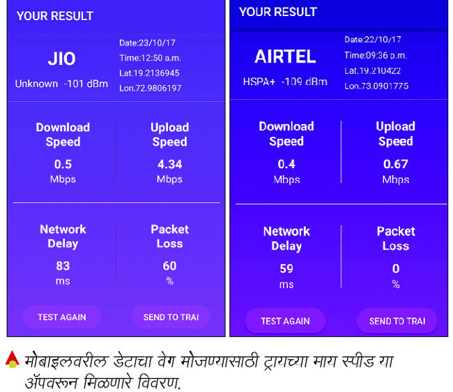 आज धडाधड येणाऱ्या थ्रीजी, फोरजीच्या ऑफर्सना ग्राहक सकारात्मक प्रतिसाद देत आहेत. कॉल किती लागतात, त्यामध्ये काही अडचणी आहेत का यापेक्षा सध्या सर्वच ग्राहक डेटामध्ये गुरफटलेले आहेत. पण त्या ऑफर्ससाठी ते जे पसे मोजतात त्या प्रमाणात त्यांना सेवा मिळते का या प्रश्नाचे उत्तर सध्या तरी नाही असेच द्यावे लागेल. ट्रायने टूजी, थ्रीजी आणि फोरजीसाठी किमान डेटा स्पीडची मर्यादा आखून दिलेली असते. तसेच ट्रायने मोबाइल हॅण्डसेटवर अॅपच्या माध्यमातून हा वेग तपासण्याची सुविधा दिली आहे. आम्ही काही हॅण्डसेटवर हा प्रयोग केला असता त्यांचा वेग अत्यंत कमी म्हणजे ०.५ एमबीपीएस ते ५.०० एमबीपीएस इतका दिसून आला. आज आपण सर्वजण आपला संपूर्ण देश फोर जी होण्याच्या दिशेने आपली वाटचाल सुरू आहे, असे म्हणत असतो आणि स्वत:ची पाठ थोपटून घेत असतो. पण त्याचवेळी आपल्या मोबाइलवर फोर जी सुविधेसाठी पसे मोजत असतानादेखील आपल्याला मिळणारा इंटरनेट डेटाचा वेग हा अगदीच नगण्य म्हणावा असा असलेला दिसून येतो. जागतिक पातळीवर थ्रीजीच्या ४.४ एमबीपीएस या वेगापेक्षा हा वेग अगदी थोडक्या प्रमाणातच अधिक असल्याचे ओपन सिग्नल यांनी केलेल्या एका सर्वेक्षणात आढळून आले आहे. तर जागतिक पातळीवर फोरजीचा सर्वसाधारण वेग हा १६ एमबीपीएस आहे. म्हणजेच जागतिक पातळीवरील वेगाच्या आपण खूपच मागे आहोत. नेटवर्कमधील त्रुटी हे यामागचे महत्त्वाचे कारण असल्याचे तज्ज्ञ सांगतात. तुम्ही तुम्हाला सुविधा पुरवणाऱ्या कंपनीच्या ग्राहक केंद्राला फोन केलात तरी त्यांचे उत्तरदेखील हेच असते, की हा डेटा वेग सव्र्हरवर अवलंबून आहे. आणि हा वेग एखाद्या ठरावीक भागात एकाच वेळी किती ग्राहक त्या सव्र्हरशी जोडले गेले आहेत त्यावरदेखील अवलंबून असतो.