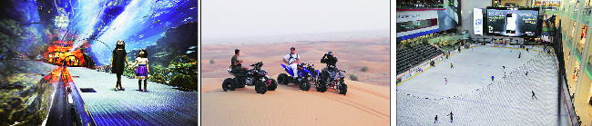 त्यामध्ये सर्वात महत्त्वाचे म्हणजे दुबई मॉल हा १५ वर्षांपूर्वी उभा राहिलेला मॉल. हा जगातील सर्वात मोठा मॉल आहे. हा केवळ एक मॉलच नाही तर मनोरंजनासाठी तेथे जे काही विकसित केलं गेलं ते सर्वच भव्यदिव्य आहे. या मॉलमध्येच एक प्रचंड मोठी आइस रिंग आहे. कृत्रिमरित्या तयार केलेल्या बर्फाची प्रचंड मोठी अशी ही मानवनिर्मित रचना. येथे आइस हॉकी, स्केटींग सारं काही करता येते. तर मॉल ऑफ इमिरेटसमध्ये तर २८० फूट उंच व ४०० मीटर लांब अशा कृत्रिम बर्फरचनेवर चक्क आईस स्कीईंगदेखील करता येते. दुबई मॉलमधील दुसरे आकर्षण म्हणजे मत्स्यालय. हेदेखील जगातील सर्वात मोठे. काचेच्या एकाच सलग तुकडय़ात याची रचना केलेली आहे. मधोमध बोगदा करून चारही बाजूला जगभरातील मासे सोडलेले आहेत. या रचनेच्या वर जाऊन एका बंदिस्त पण जाळीदार पोलादी पिंजऱ्यातून आपणाला थेट पाण्यात उतरण्याची सुविधादेखील येथे आहे.