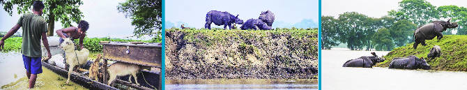 २०१७ मध्ये आसाममधील पुरात ३१ एकशिंगी गेंडय़ांसह एकूण ३६१ प्राणी वाहून गेले होते. त्यानंतर पूरकाळात सखल भागात राहणाऱ्या प्राण्यांना सुरक्षित जागा उपलब्ध व्हावी म्हणून अभयारण्य क्षेत्रात ३३ उंच जागा कृत्रिमरीत्या तयार करण्यात आल्या. यंदाच्या पुरात परिणामी अनेक प्राण्यांनी या कृत्रिम उंच जागी आसरा घेतल्यामुळे त्यांचा जीव वाचला.