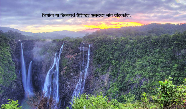 म्हैसूर, कुर्ग, काबिनी, वायनाड ही एकमेकांना जोड असलेली पर्यटनस्थळांची रांगच आहे. तुलनेने शिमोगा हे आडवाटेला आहे. पश्चिम घाटातील तुलनेने कमी वर्दळीचे असे हे ठिकाण तसे पर्यटनाच्या नकाशावर फारसे दिसत नाही. उडुपीवरून रेल्वेने येथे पोहोचता येते. घनदाट वनराजी हे याचे वैशिष्टय़ आहेच. पण त्याचबरोबर येथून जवळच असलेला जोग वॉटरफॉल हे आणखीन एक महत्त्वाचे आकर्षण ठरते. दोनचार दिवसाचा येथील मुक्काम आणि त्याला जोडून मग जोग वॉटरफॉल अशी चार-पाच दिवसाची उत्तम ट्रिप येथे करता येते. जोग वॉटरफॉल्सला जोडूनच आपल्याला तीन प्राचीन मंदिरांची भटकंतीदेखील करता येते. शिमोग्याहून धुक्यात हरवणाऱ्या अगुम्बे येथेदेखील जाता येते. पण तुलनेने ते उडुपीपासून जवळ आहे. शिमोगाहून आपण गोव्यात उतरू शकतो किंवा बेळगावला येऊन पुढे दांडेलीला जाता येते. मस्त आराम करायचा असेल तर हे ठिकाण उत्तम पर्याय आहे.