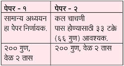 पेपर १ : भारतीय भाषा प्रश्नपत्रिका – संविधानाच्या आठव्या परिशिष्टात नमूद भाषांमधून उमेदवाराने निवड केलेल्या भाषेची प्रश्नपत्रिका. इथे मराठी भाषा पेपर आपण निवडू शकतो. या पेपरसाठी ३०० गुण आहेत.