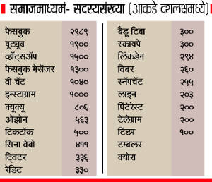 जगात सोशल मीडियावर दर मिनिटाला ८४० नवीन वापरकर्ते सहभागी होतात. २०१३ च्या तुलनेत २०१७ मध्ये ट्विटरवर ५८ टक्के ट्वीट्स वाढल्या. २०१७ मधल्या ट्वीट्सची संख्या दर मिनिटाला ४५५,००० एवढी होती. यूटय़ूबच्या वापराबाबतची आकडेवारी सांगते की, २०१४-२०१६ मध्ये दर मिनिटाला ४०० तासांचे व्हिडीओ यूटय़ूबवर बघितले जात असत. आता ४,१४६,६०० व्हिडीओ दर मिनिटाला बघितले जातात. इन्स्टाग्रामवर दर मिनिटाला ४६,७४० पोस्ट अपलोड केल्या जातात. २०१३ मध्ये दर मिनिटाला जेवढय़ा फेसबुक पोस्ट शेअर व्हायच्या त्यांच्या संख्येत २०१६ पर्यंत २२ टक्के वाढ होऊन त्यांची संख्या ३ कोटींच्या आसपास गेली. आता फेसबुकवर दर मिनिटाला ५१०,००० कॉमेंट्स केल्या जातात, २९३,००० स्टेट्स अपडेट होतात, १३६,००० फोटो अपलोड होतात. दर मिनिटाला ४ कोटी लाइक्स दिले जातात. दर मिनिटाला ३,६०७,०८० गुगल सर्च होतात आणि दर मिनिटाला जगभरात १५,२२०,७०० एवढे लिखित मेसेज पाठवले जातात.
