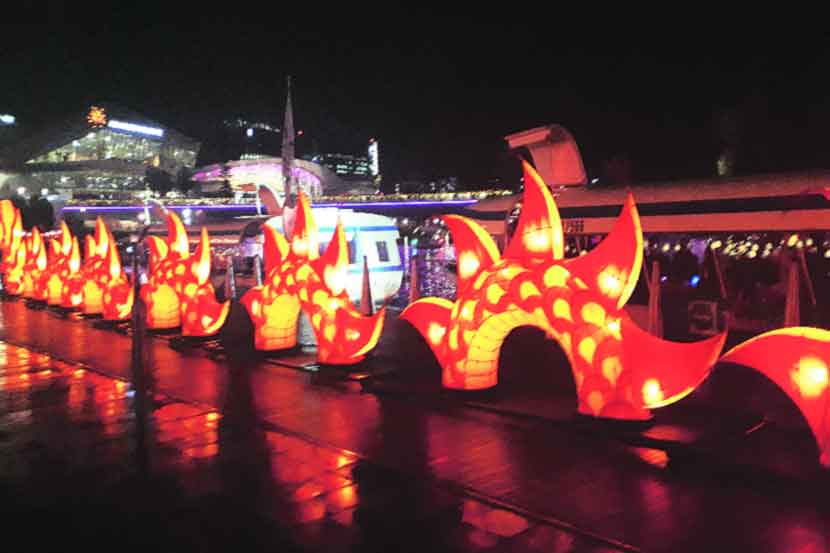 आता ढोलाचा शिस्तबद्ध आवाज येऊ लागतो. मुलांनी खादाडीपुर्वी तयार केलेले आकाशकंदील लावले जातात, नदीमध्ये इतका वेळ अंधारात लपून राहिलेले दिवे लागतात. ही सर्व तयारी असते ‘त्या’च्या आगमनाची. तो अनेक फूट उंच आणि बऱ्यापैकी लांबुळका असतो. धगधगत्या केशरी लाल रंगाचा-ड्रॅगनचा आकाशदिवा मिरवत मिरवत निघतो. त्याला वाहून न्यायला अनेक स्वयंसेवक असतात. ढोलाच्या तालावर तो दमदारपणे येत राहतो. मग अनेक बनावटींचे मोठाले आकाशदिवे येत राहतात. चीनचा राष्ट्रीय प्राणी पांडा, भारताचा राष्ट्रीय पक्षी मोर, तसेच खवलेदार प्रकाशमान रंगीत मासे, पंचरंगी हलते व उडण्याचा भास निर्माण करणारे लॉर्किट पक्षी, हत्ती, इतकाच काय, भारतीय पोशाखातील स्त्री व पुरुषांचे दिवे मानवंदना स्वीकारत येत राहतात. या आणि अशा अनेक पारदर्शी प्रकाशमान आकृत्या डोळ्यापुढून सरकत राहतात. ही मिरवणूक ठरल्या वेळी सुरू होते. शाळा व विद्यापीठासांरख्या बहुतांश संस्थांनी हे दिवे तयार केलेले असतात. त्या मोठय़ा आकाशदिव्यांमागे मग त्या त्या शाळेतली मुलं छोटे कंदील घेऊन विजयी मुद्रेने मिरवणुकीतून चालत असतात. अर्थात हे दिवे उंच नि रुंद असल्यानं ते तुम्हाला लांबून, बसूनदेखील सहज दिसू शकतात.