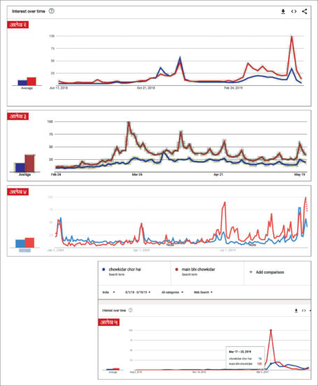 २०१९ च्या सार्वत्रिक निवडणुकीत सत्तारूढ आणि विरोधी पक्षांची प्रचारात सर्वात मोठी टॅगलाइन होती- ‘चौकीदार चोर है’! (जो काँग्रेसचा आरोप होता.) त्याला भाजपचं उत्तर होतं- ‘मं भी चौकदार’! ऑगस्ट २०१८ ते मे २०१९ पर्यंतच्या अभ्यासात केरळ आणि तमिळनाडूमध्ये भाजपविरुद्धच्या ‘चौकीदार चोर है’चा जोर दिसतो. पंजाब, आंध्र प्रदेश आणि तेलंगणामध्ये पाहिलं तर ‘मं भी चौकीदार’चा जोर फार कमी दिसतो. निवडणुकीचे निकाल पाहता पंजाब, तमिळनाडू, पश्चिम बंगाल, आंध्र, तेलंगण आणि केरळ या राज्यांत भाजपला कमी यश मिळाले. अजून एक गंमत म्हणजे ‘मं भी चौकीदार’मधला रस मार्च २०१९ मध्ये अचानक वाढला आणि तो ‘चौकीदार चोर है’च्या जवळ जवळ सहापट झाला. आणि याच वेळी देशात निवडणुका सुरू झाल्या होत्या. निकाल लागल्यावर पाहिलं तर भाजपला मिळाल्या ३०३ जागा आणि काँग्रेसला फक्त ५२! म्हणजे भाजपने काँग्रेसपेक्षा जवळजवळ सहापट जागा जास्त जिंकल्या! काय योगायोग!