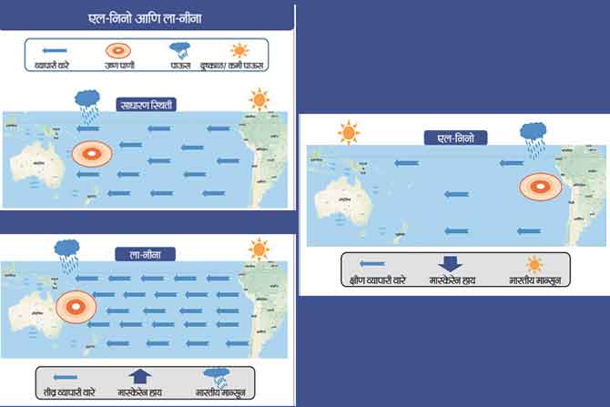 तर सामान्यपणे व्यापारी वारे (Trade Winds) हे पूर्वेकडून पश्चिमेकडे वाहतात. या वाऱ्यांमुळे प्रशांत महासागरातील उष्ण पाणी पश्चिमेकडे- म्हणजे आशिया खंडाकडे नेले जाते. या उष्ण प्रवाहामुळे या भागातले तापमान वाढून हवा विरळ होते आणि त्यातील बाष्पामुळे त्यातून ढग तयार होतात व त्या भागात- ऑस्ट्रेलिया, इंडोनेशिया- चांगला पाऊस पडतो. याचाच एक दुसरा आणि उलट परिणाम पेरू, इक्वेडोर या देशांवर दिसून येतो. कोरडय़ा वाऱ्यांमुळे इकडे पाऊस पडत नाही आणि त्यांना दुष्काळाचा सामना करावा लागू शकतो. पण याचबरोबर महासागरातील गरम पाण्याची जागा तळातील थंड पाण्याने घेतली जाते; ज्यामुळे त्या भागात माशांचे प्रमाण वाढून मासेमारीसाठी चांगली परिस्थिती निर्माण होते.