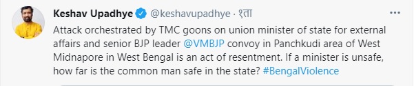 पश्चिम बंगालमधील मिदनापूर येथील पंचकुडी भागात केंद्रीयमंत्री आणि भाजपाचे ज्येष्ठ नेते व्ही. मुरलीधरन यांच्या वाहन ताफ्यावर तृणमूल काँग्रेसच्या गुंडांनी केलेला हल्ला हा संतापजनक आहे. जर मंत्री असुक्षित आहे, तर सामान्य माणूस राज्यात किती सुरक्षित असेल? असा प्रश्न भाजपा प्रवक्ते केशव उपाध्ये यांनी उपस्थित केला आहे.