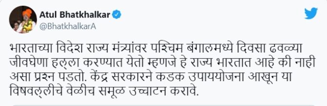 याचबरोबर “भारताच्या विदेश राज्यमंत्र्यांवर पश्चिम बंगालमध्ये दिवसा ढवळ्या जीवघेणा हल्ला करण्यात येतो, म्हणजे हे राज्य भारतात आहे की नाही? असा प्रश्न पडतो. केंद्र सरकारने कडक उपाययोजना आखून या विषवल्लीचे वेळीच समूळ उच्चाटन करावे. ” असं भाजपा नेते अतुल भातखळकर म्हणाले आहेत.