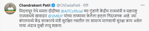 तर, “मिदनापूर येथे ममता दीदींच्या तृणमूल काँग्रेसच्या गुंडांनी केंद्रीय राज्यमंत्री व महाराष्ट्र राज्यसभेचे खासदार व्ही. मुरलीधरन यांच्या ताफ्यावर केलेला हल्ला निंदाजनक आहे. ज्या बंगालमध्ये केंद्र सरकारचे मंत्री सुरक्षित नसतील तर सामान्य माणसाची सुरक्षा काय असेल? याचा अंदाज तुम्ही लावू शकता.” असं भाजपा प्रदेशाध्यक्ष चंद्रकांत पाटील यांनी म्हटलं आहे.