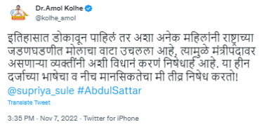 अन्य एका ट्वीटमध्ये, “इतिहासात डोकावून पाहिलं तर अशा अनेक महिलांनी राष्ट्राच्या जडणघडणीत मोलाचा वाटा उचलला आहे, त्यामुळे मंत्रीपदावर असणाऱ्या व्यक्तींनी अशी विधानं करणं निषेधार्ह आहे. या हीन दर्जाच्या भाषेचा व नीच मानसिकतेचा मी तीव्र निषेध करतो,” असं म्हणत अमोल कोल्हेंनी सुप्रिया सुळे यांना टॅग करत अब्दुल सत्तार यांच्या नावाचा हॅशटॅग वापरला आहे.