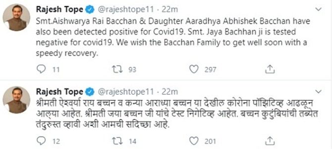“ऐश्वर्या राय-बच्चन आणि त्यांची लेक आराध्या अभिषेक बच्चन या दोघींचीही करोना चाचणी पॉझिटिव्ह आली आहे. तसंच जया बच्चन यांची चाचणी मात्र निगेटिव्ह आली आहे. बच्चन कुटुंबातील सदस्य लवकरच बरे होवोत, ही सदिच्छा”, असं ट्विट राजेश टोपे यांनी केलं आहे.