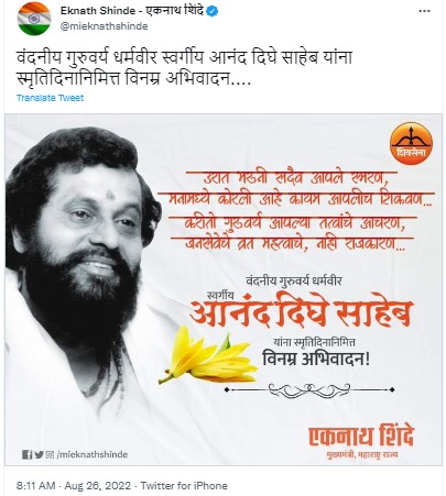एकनाथ शिंदे यांनी त्यांच्या फेसबुक, ट्विटर आणि इन्स्टाग्राम अकाऊंटवरुन दिघे यांना श्रद्धांजली वाहणारी पोस्ट केली आहे. “वंदनीय गुरुवर्य धर्मवीर स्वर्गीय आनंद दिघेसाहेब यांना स्मृतिदिनानिमित्त विनम्र अभिवादन” या कॅप्शनसहीत मुख्यमंत्र्यांनी आनंद दिघेंना श्रद्धांजली अर्पण करणारी पोस्ट शेअर केली आहे. आपल्या प्रत्येक भाषणामध्ये शिवसेनाप्रमुख बाळासाहेब ठाकरेंबरोबरच आनंद दिघेंचा आवर्जून उल्लेख करणाऱ्या एकनाथ शिंदे यांनी शेअर केलेल्या फोटो पोस्टमध्ये आनंद दिघेंचा फोटो आणि त्याबाजूला चारोळी असल्याचं दिसत आहे.