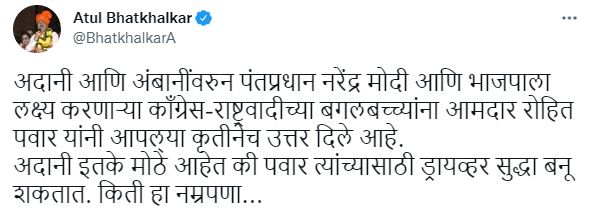 दरम्यान भाजपा नेते अतुल भातखळकर यांनी यावरुन राष्ट्रवादी काँग्रेसला टोला लगावला आहे. “अदानी आणि अंबानींवरुन पंतप्रधान नरेंद्र मोदी आणि भाजपाला लक्ष्य करणाऱ्या काँग्रेस-राष्ट्रवादीच्या बगलबच्च्यांना आमदार रोहित पवार यांनी आपल्या कृतीनेच उत्तर दिले आहे,” असा टोला अतुल भातखळकरांनी लगावला आहे.