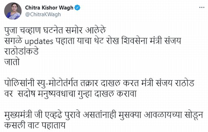 चित्रा वाघ यांनी ट्विट केलं असून एक व्हिडीओ शेअर केला आहे. यामध्ये त्यांनी पूजा चव्हाण घटनेत समोर आलेले सगळे अपडेट्स पाहता याचा थेट रोख शिवसेना मंत्री संजय राठोडांकडे जातो असं त्यांनी म्हटलं आहे.